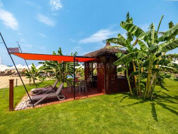 На пляже зонты от солнца стоят слишком низко - постоянный риск удариться головой. Рекомендую идти под навесы.