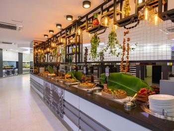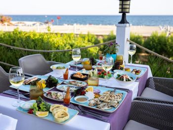 1. Еда за швецким столом вкусная, свежая, разнообразная: мясо, рыба, фрукты, овощи, пицца, супы, сыры, сладости и т.д. На завтрак есть, что выбрать: каши, омлеты, мюсли и т.д. Есть, что предложить детям. Еду накладывают повара, обслуживают быстро, очередей больших нет. Хороший кофе везде. Также предлагают 3 вида турецкого вина, шампанское и пиво.