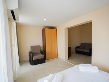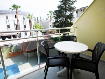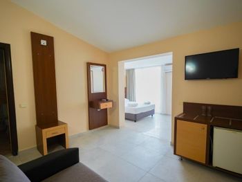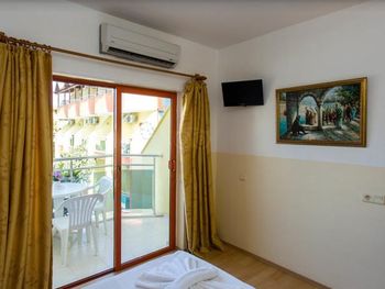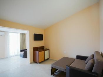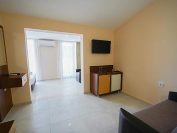 Мы останавливались здесь на двое суток. В целом, нам понравилось проживание. Отель достаточно большой, мы бронировали стандартный номер, но сотрудник без доплаты предложил нам поселиться в более просторном номере на последнем этаже. номер хороший, очень просторный, состоящий как бы из двух комнат, в каждой из которой есть спальные места. В номере большие окна в пол, одна из них - дверь купе, ведущая на большой балкон, там было 3 стула, столик и настенная сушилка для белья. Нам достался номер 401 с видом на бассейн, с торца балкона виднеются горы. В отеле был включен пансион по типу шведского стола. Питание нам понравилось - есть выбор, все вкусно. На ужин можно было взять рыбу, куриное филе в панировке, был вкусный суп, нарезано очень много зелени - шпинат руккола укроп кинза, несколько видов салатов. Завтрак тоже очень понравился - вкусно приготовленная яичница, мюсли с молоком, два вида колбасы, несколько видов сыра, много овощей. Для отеля до 50 евро в сутки - шикарное питание. Зона приема пищи просторная, с панорамным остеклением, нам было приятно проводить там время. Утром играет приятная расслабляющая музыка, вечером тихо спокойно. отель расположен недалеко от пешеходной улицы, до пляжа 700 метров. . В отеле уборка была каждый день. Мы себя комфортно чувствовали находясь там. В номере было 2 фена, небольшой холодильник, чайника не было, но на первом этаже стоял кулер с горячей и холодной водой.