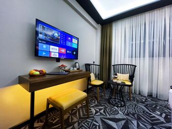 Площадь номера не соответствует заявленной, маловат, потолки низкие. В душевой плесень, отваливающиеся от стены крепления душа, дешевая плитка на стенах. Унитаз расположен слева прямо у двери, которая открывается внутрь, т.е. если сидишь на унитазе дверь не открыть, она упирается в твою правую ногу, тихий ужас, такого неудачного расположения унитаза ранее вообще нигде не видела. Как минимум дверь должна открываться наружу. Гигиенический душ отсутствует. Гель для душа, шампунь закреплены на высоте 1,5 метра, что совсем неудобно. Зубных принадлежностей нет, хоть бы минитюбик пасты положили на 1 раз. Вытяжка в санузле включается по умолчанию вместе со светом и очень громкая, что тоже доставляло дискомфорт. Заявленных халатов, утюга с гладильными принадлежностями в номере не было. Телевидение также отсутствововало, хотя заявлено и спутниковое и кабельное. По факту лишь smart TV, который даже не настроен и не работал. Кондиционер дует на кровать четко в голову и грудь, но без него тоже спать невозможно, поскольку на окнах отсутствуют москитные сетки. Вида из окна конечно же никакого нет, хотя 7 этаж, но его как раз я и не ожидала. Когда уже почти спали около 00:30 заявилась какая-то женщина, просто пришла и открыла дверь при том, что было закрыто на доп.замок. Какая была её цель остается загадкой, но впечатление отвратительное. Как такое вообще могли допустить.