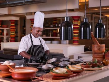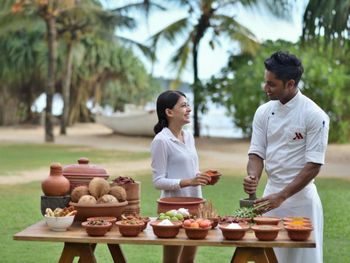 Гости могут посещать различные рестораны отеля или заказать барбекю на террасе. В курортном спа-отеле Weligama Bay Marriott работают бизнес-центры. Во всех помещениях подключен бесплатный Wi-Fi. На территории можно воспользоваться бесплатной частной парковкой. На круглосуточной стойке регистрации гости могут пройти экспресс-регистрацию заезда и отъезда. По запросу предоставляются услуги консьержа.
