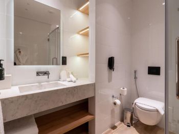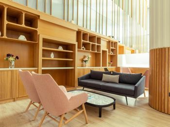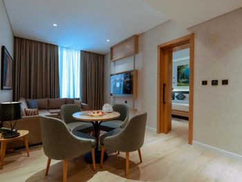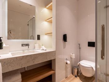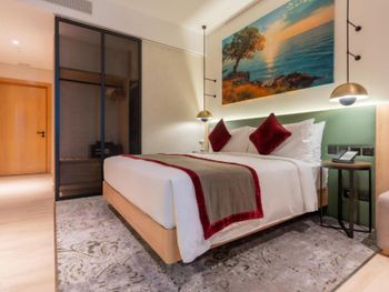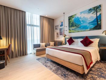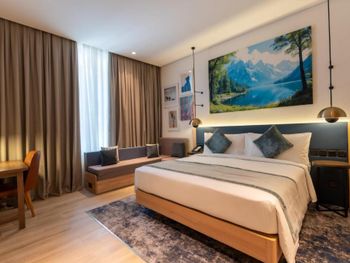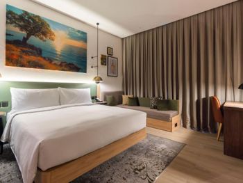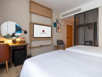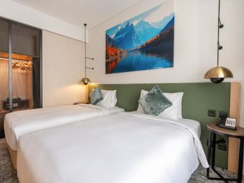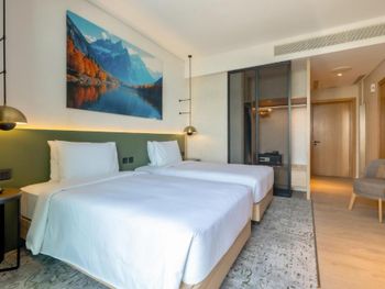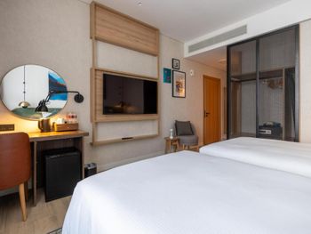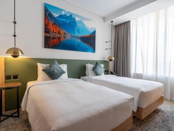 Новый отель, чисто, спокойный современный интерьер. Персонал приветливый. Очень хороший разнообразный завтрак. Тренажерный зал с минимальным набором, в основном кардиотренажеры. Бассейн маленький, на открытом воздухе, скорее не поплавать, а просто поплескаться. Район новый, кругом ничего интересного, поэтому необходимо воспользоваться такси или метро( находится в 2 км). Но сам квартал небольшой, но достаточно комфортный- отели, магазины, кафе, променад. Интернет нормальный.