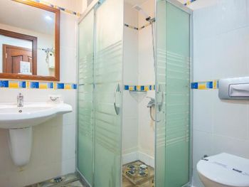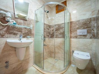 з минусов: в номерах нет питьевой воды. Считаю это серьезным недостатком, в конце концов, 20-30 лир - не такая большая сумма, чтобы не поставить бутылочку воды для гостя. В душе нет гибкой лейки - это неудобно. Вода часто едва теплая. Требуют замены входные и межкомнатные двери - выглядят уже убого и замок прям вываливается из двери. Санузел в хорошем состоянии, но нет геля для душа и принадлежности за 5 дней пребывания мне ни разу не пополнили. В номере не работал телевизор - если это для кого-то важно, я не стала заморачиваться. Впрочем, на ресепшн не всегда кто-то есть - непонятно, к кому обращаться по вопросам. Если вы привыкли рано ложиться спать - здесь это не получится, территория отеля небольшая, достаточно шумно на улицах вокруг и возвращающиеся поздно гости отеля тоже не спешат соблюдать тишину, что в отсутствие нормальной звукоизоляции будет вас беспокоить. Меня это не сильно тревожило, но считаю важным написать для тех, кому это может быть принципиально. Шезлонги вокруг бассейна уже все заняты полотенцами в 8-00 - учитывайте здешнюю практику, если хотите отдыхать у бассейна.