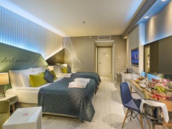 Отличный отель) была интересная развлекательная программа. Вкусная и разнообразная еду, приветливый персонал. Во всех номерах одна двухспальная кровать и одна односпальная.
