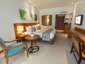 В номере все продуманно до мелочей,много полок( для вещей),халаты,тапочки,сланцы и полотенца для бассейна,зонтики,кофе,чай,чайник,все безупречно. Спасибо за такой уютный и ухоженный отель