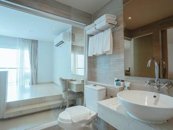 Нам повезло достался номер с красивым видом на море. Чистый, просторный. Завтрак шведский стол, есть их чего выбрать вне зависимости от того, предпочитаешь ли местную или европейскую еду. Бассейн с гидромассажной секцией. Есть свой пляж достаточно глубокий. До городского пляже, который тоже чистый, в отличае от Паттайи минут 15 пешком. Приехали на своей арендованнной машине, поэтому про то насколько удобно добираться сказать не могу. До Паттайи можно добраться в среднем где-то за пол часа.