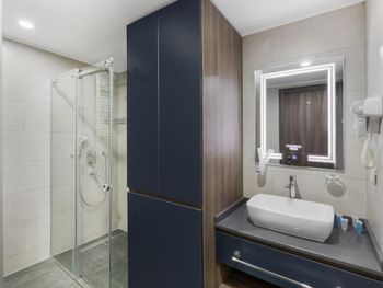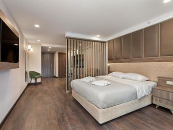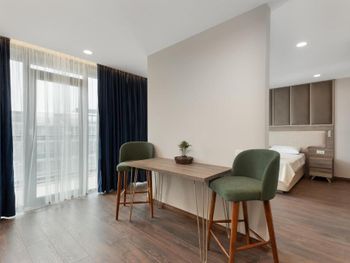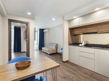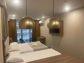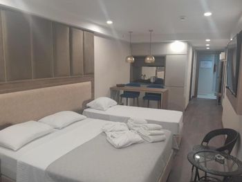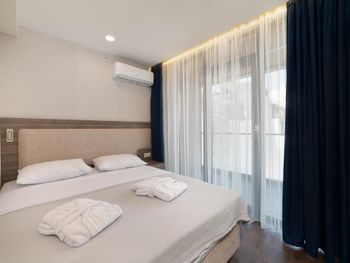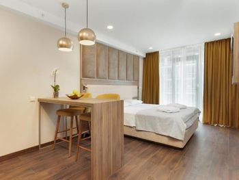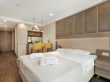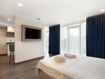 Очень приятный свежий отель, вежливый персонал, просторный номер студия. Всё удобно, кондиционер, балкон, большой телевизор, мини кухня с мойкой, конвекционной варочной плитой, минимальным необходимым набором посуды, чайником, холодильником. Замечательная комфортная кровать и подушка, что очень важно для полноценного отдыха! Для каждого гостя предусмотрены 3 полотенца, халат, тапочки. Есть стиральная машина, сушилка, утюг - очень необходимый набор при длительном пребывании. Душ удобный.