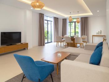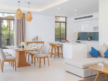Вилы с очень качественной отделкой и превосходным дизайном интерьера. Качественная мебель, большие кровати с ортопедическими матрасами, чистое белоснежное постельное бельё. Индивидуальные санузлы в каждой спальне. Кондиционирование в каждом помещение. Бассейны на виле и центральный у пляже с тёплой водой. Полотенца и спасательные жилеты можно взять у бассейна бесплатно. Пляж и вода в море намного чище чем в Нячанге. Дно пологое, волны небольшие, что удобно для маленьких детей. В ресторане большой выбор местных фруктов, зелёных овощей, риса и блюд азиатской кухни.