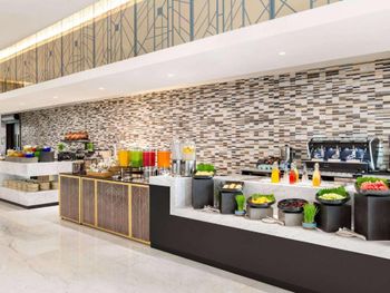 Ежедневно гостям подают завтрак «шведский стол», континентальный завтрак или полный английский/ирландский завтрак. При Wyndham Grand Doha West Bay Beach работает ресторан, где подают блюда местной кухни и блюда международной кухни. По запросу для гостей приготовят вегетарианские, безлактозные и халяльные блюда.
