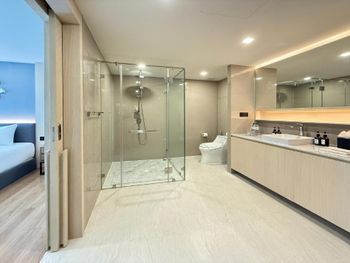 Отличная кровать, которая шире длины, чистое постельное белье, халаты, гигиенические наборы, места хранения. Наш номер был угловой, в дополнение к тому, что он звукоизолирован. Хорошая площадь номера. Приятное освещение, хороший напор горячей воды.