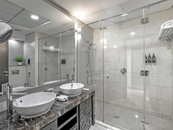 В нашем первом номере двери разбухли и закрывались с усилием и грохотом. Халатов в первом номере не было. Банка с шампунем отвалилась от стены и валялась на полу. Вода из душа заливала весь пол туалета и стояла весь день. Вызванный мастер сказал, что починить это невозможно, можно только дня за два сделать бортик, чтобы вода за него не переливалась. То есть, здравствуй угроза грибка. Нам предложили поменять номер...на меньший. Потом все же в результате долгих (почти весь день!) переговоров предоставили бОльший номер. И там был такой бортик в душе. То есть, проблема, видимо, во всем отеле - ошибки при строительстве.