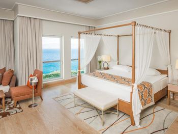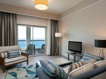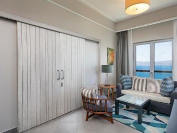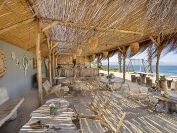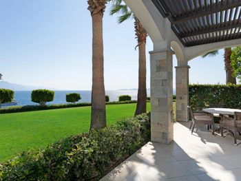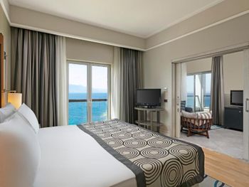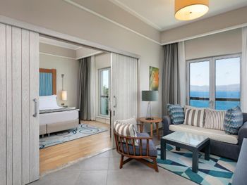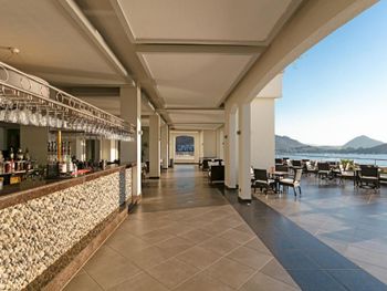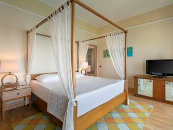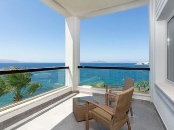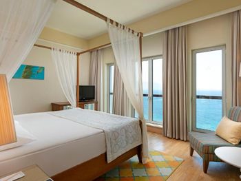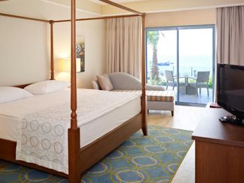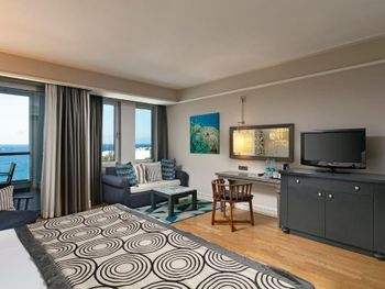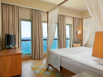 Интересное расположение на острове, со всех сторон очень красиво. Ветренно, не жарко Вкусные завтраки и ужины. Обеды средние. Большие номера