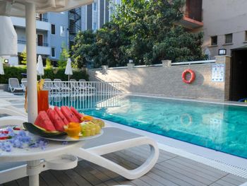 Очень добродушный персонал. На ресепшен русскоговорящие ребята. Всегда помогали, подсказывали и были очень дружелюбные и отзывчивые. Работники ресторана тоже все очень душевные. Всегда выходил шев-повар приветствовать, ребята официанты шустрые, все быстро убирали и приносили. Еда была вкусная. Много овощей, в основном курица, реже говядина, тефтели, овощи с фаршем, рыба. В номерах убирали хорошо. Расположение отеля очень удобное для городского отеля. Выбирали такой сознательно. Рядом пляж Клеопатра (10 минут медленным шагом), достопримечательности (пещера, крепость) и магазины. Все удобно. Этот отель скорее для взрослых, для отдыха с детьми я бы выбрала другой отель, потому что для детей особенно ничего не предусмотрено (Нет аниматоров, детских клубов и дискотек) да и еда для детей не очень разнообразна (макароны, картофель не всегда).
