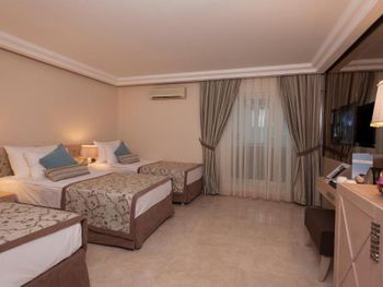 Ждали номер до 14:35. Что несколько огорчило вначале. Если едите с ребёнком или детьми лучше берите два номера. На узком диванчике что раскладывается спать может ребёнок наверное свободно только пятилетний или младше. Постарше ребёнку тесновато. Громкая музыка на русском допоздна - учитывайте это если вы с детьми. Питание было самое слабое из всех отелей что мы посетили в Турции в октябре. Ходили часто в кафе и рестораны рядом на улицах. Если не ищите супер-условия, а просто хороший пляж то принципе нормально. Мы были 2 дня и нас устроил и отель и пляж и персонал. Несмотря на общий спад туристов в этом отеле было их много и отдыхали гости активно, поэтому отель имеет спрос и слава Богу. Всем процветания!