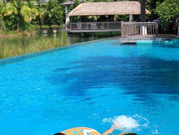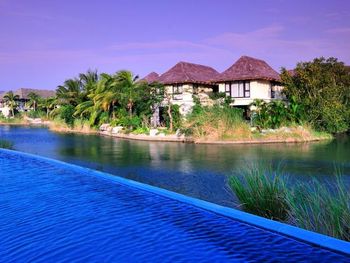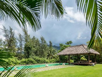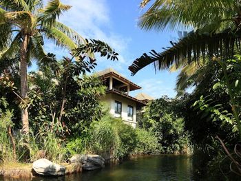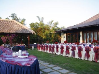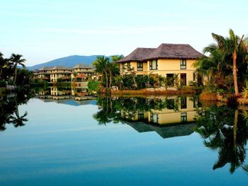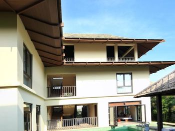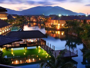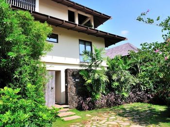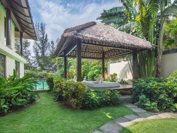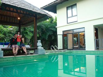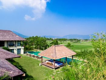 Отдельные дома. Отельный бассейн у дома. Очень много зелени. На территории Отеля есть Санаторий Тайцзы. Получилось 2 в 1. Отдых и Лечение вместе !)