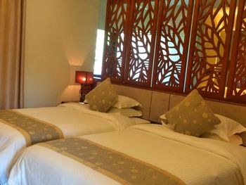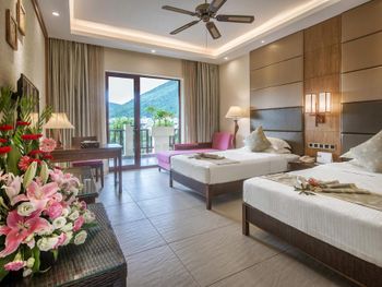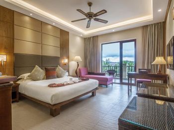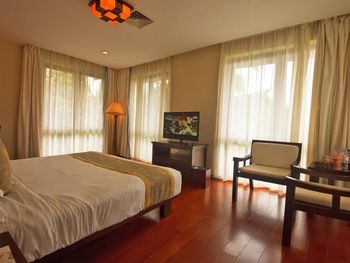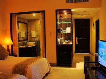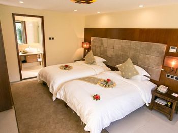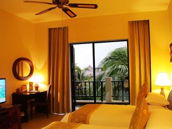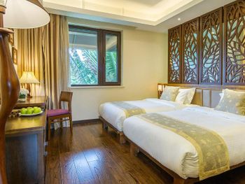 Не рекомендую бронировать номера в виллах на первом этаже с выходом к собственному бассейну, мы так обожлись. Виллы стоят на бетонном основании, пол керамогранитный, плюс есть некий косяк с вентиляцией, в связи с чем в номере невероятная сырость((( пол номера занимает ванная комната в которой есть пол с подогревом и вот в ней находится гораздо комфортнее чем в самом номере, я не смогла заснуть этой ужасной ночью, проведенной в этом погребе. На утро я полная решимости пошла на ресепшен менять этот гадкий номер на номер в основном здании гостиницы (этаж второй-третий), иначе я бы уехала из этой гостиницы, однозначно. Благодаря русско-китайскому переводчику на смартфоне донесла свою мысль до сотрудников ресепшена, с английским вообще туго у большинства. Дали номер на 3 этаже, все прекрасно, сухой, отличный вид на горы и сад, вообщем небо и земля с предыдущим вариантом. Но разницу в деньгах разумеется никто не вернул, ну да ладно, хоть отдых был спасён. Пляж у отеля шикарный, лежаки всегда есть. О чистоте: полы в номере я всегда перемываю в гостиницах в Азии, мне всегда грязно, так что ничего нового здесь не было. Завтраки ориентированы конечно на китайцев, но достаточно разнообразные, мы нашли что поесть.