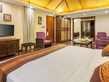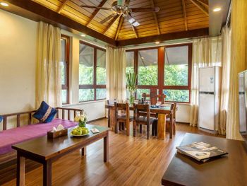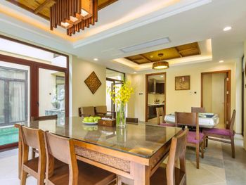 В отеле нет англоговорящего персонала, хотя многие надписи сделаны на английском, правда с ошибками, но в целом понятно. Отель не отвечает на сообщения через booking.com. На вилле, хотя есть кухня, на ней нет плиты (только СВЧ) и практически никакой посуды, кроме бокалов и чашек. Мебель несколько потертая и устаревшая, стиль аскетичный. В бассейне неудобная лестница, очень высоко находится нижняя ступенька. Бассейн окружен пальмами и деревьями, с которых падают сухие листья и семена, один раз попала ящерица. А в последний день пребывания в нем оказалась даже дохлая рыба. Видимо, ее бросил кто-то из персонала, так как рядом пруд и у берега закинут садок для ловли рыбы. Но самым большим нашим разочарованием был ужасный WiFi. Сотрудники на рецепции не смогли нам помочь установить его на ноутбук, но так как он нужен был для работы, пришлось настоять на вызове специалиста, но и после этого нельзя сказать, что он хорошо работал.