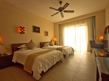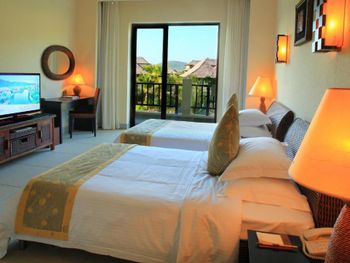 Не рекомендую бронировать номера в виллах на первом этаже с выходом к собственному бассейну, мы так обожлись. Виллы стоят на бетонном основании, пол керамогранитный, плюс есть некий косяк с вентиляцией, в связи с чем в номере невероятная сырость((( пол номера занимает ванная комната в которой есть пол с подогревом и вот в ней находится гораздо комфортнее чем в самом номере, я не смогла заснуть этой ужасной ночью, проведенной в этом погребе. На утро я полная решимости пошла на ресепшен менять этот гадкий номер на номер в основном здании гостиницы (этаж второй-третий), иначе я бы уехала из этой гостиницы, однозначно. Благодаря русско-китайскому переводчику на смартфоне донесла свою мысль до сотрудников ресепшена, с английским вообще туго у большинства. Дали номер на 3 этаже, все прекрасно, сухой, отличный вид на горы и сад, вообщем небо и земля с предыдущим вариантом. Но разницу в деньгах разумеется никто не вернул, ну да ладно, хоть отдых был спасён. Пляж у отеля шикарный, лежаки всегда есть. О чистоте: полы в номере я всегда перемываю в гостиницах в Азии, мне всегда грязно, так что ничего нового здесь не было. Завтраки ориентированы конечно на китайцев, но достаточно разнообразные, мы нашли что поесть.