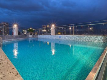 Бассейн на крыше, по идее закрыт ночью, но по факту двери открыты везде, можно купаться и смотреть на город в огнях, классно.