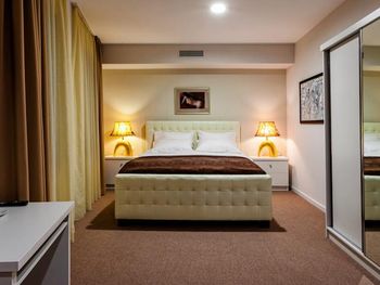 Светлые номера оформлены в классическом стиле с использованием теплых тонов и располагают кондиционером, телевизором с плоским экраном, холодильником и собственной ванной комнатой.