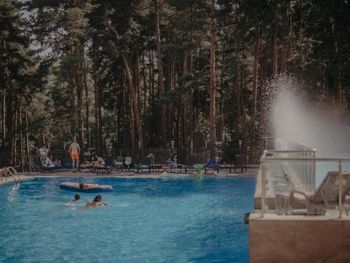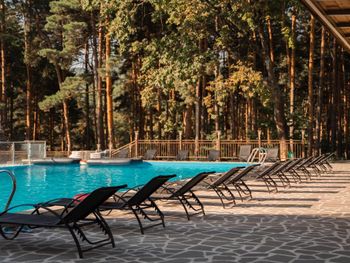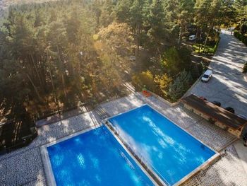 Красивая территория, сосны, гамаки.. Бассейн закрытый хороший, но прохладный. Вид из окна.