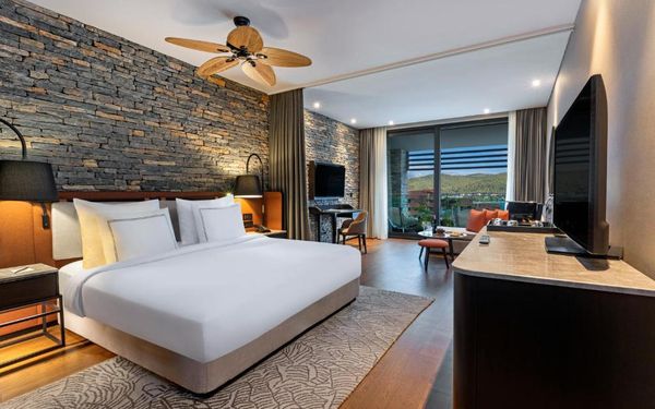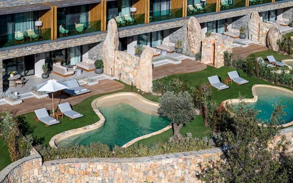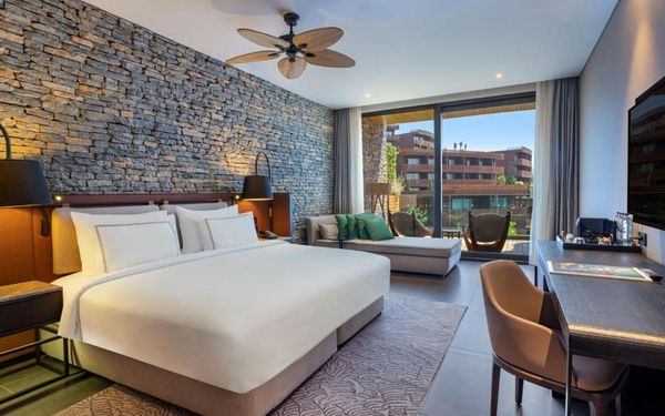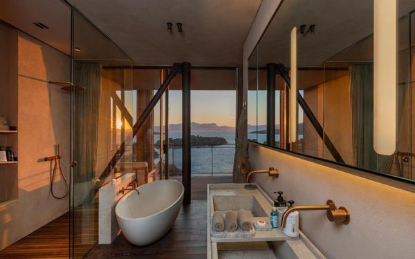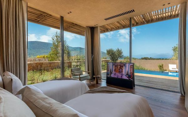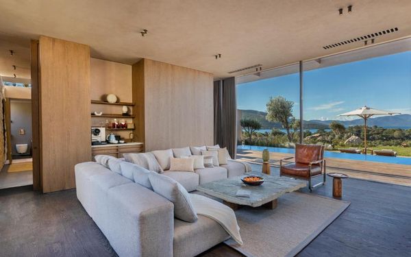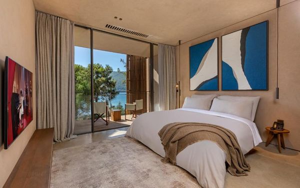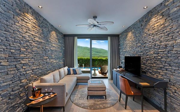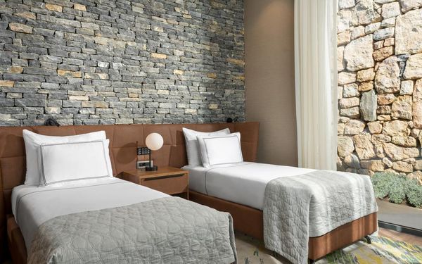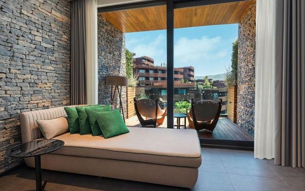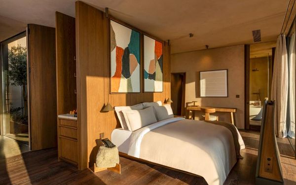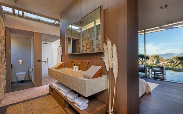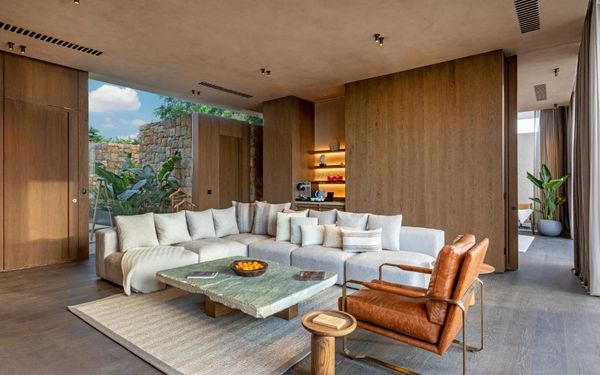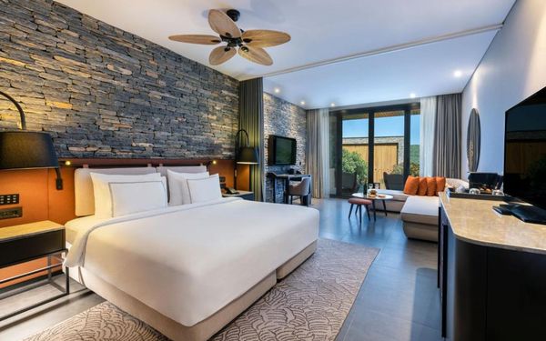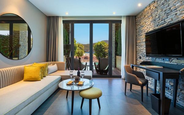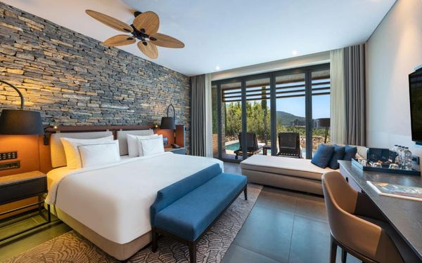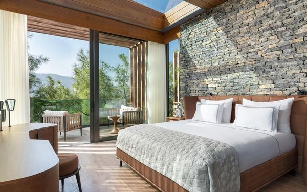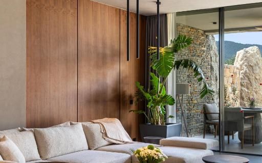 All rooms and suites are elegantly designed and include private balconies or terraces, modern interiors, and premium amenities. Selected villas, nestled among natural rock formations, offer private pools and gardens for an elevated sense of privacy and luxury. Each accommodation features air conditioning, a flat-screen TV with satellite channels, a walk-in wardrobe or seating area in select rooms, and a stylish bathroom equipped with double sinks, bathrobes, slippers, and luxury toiletries.