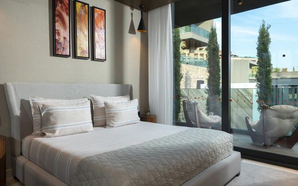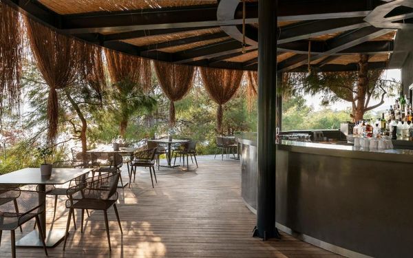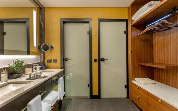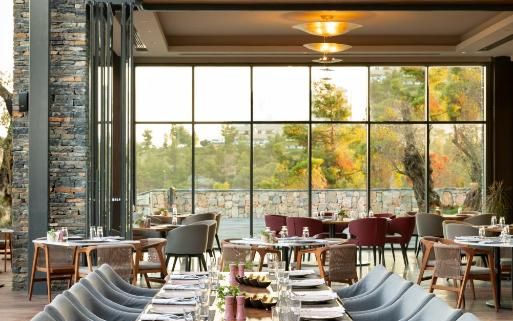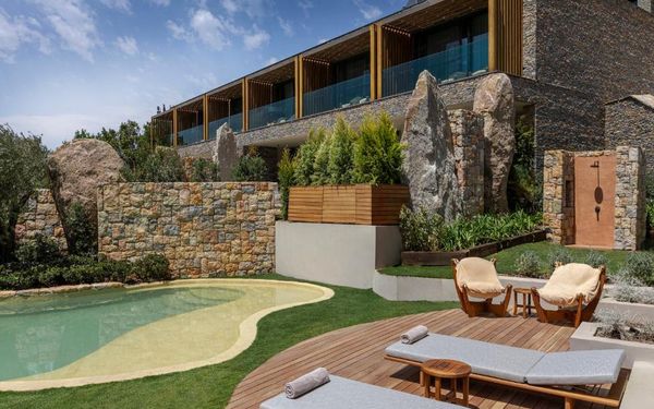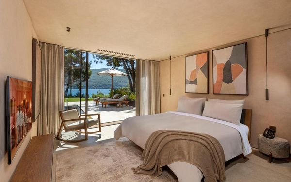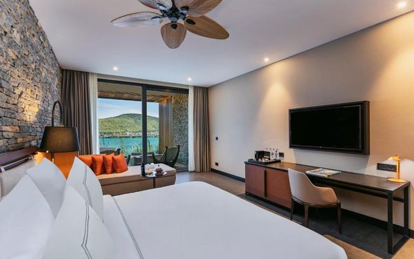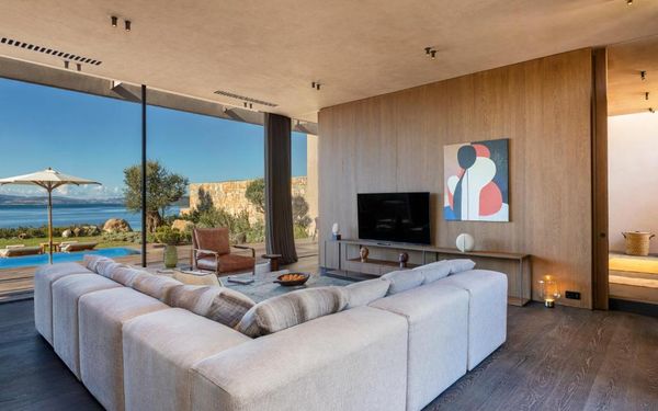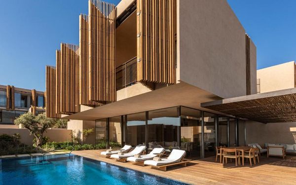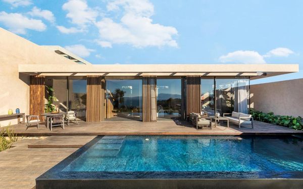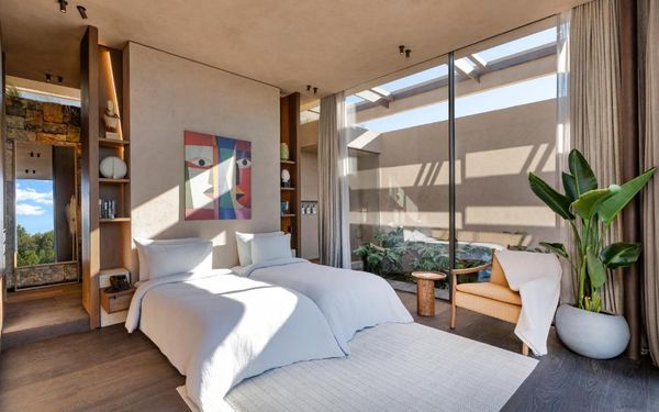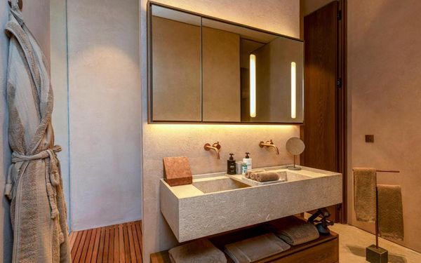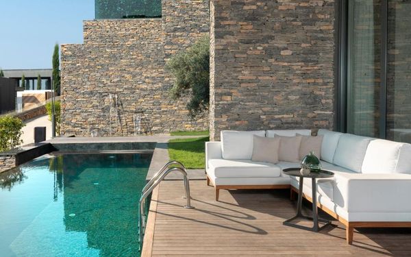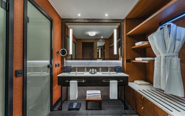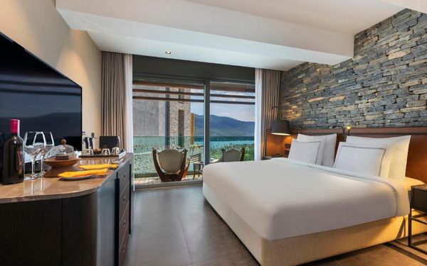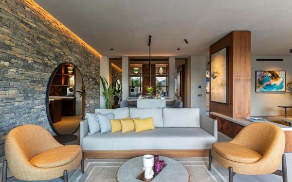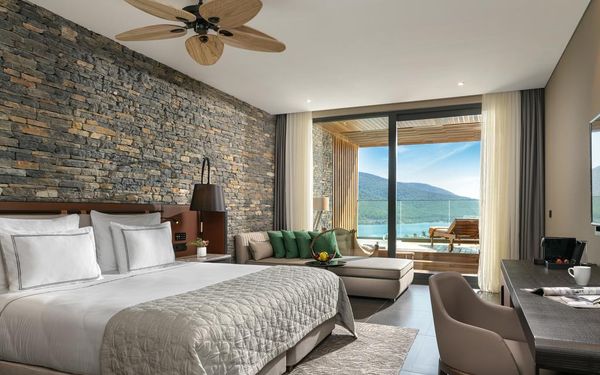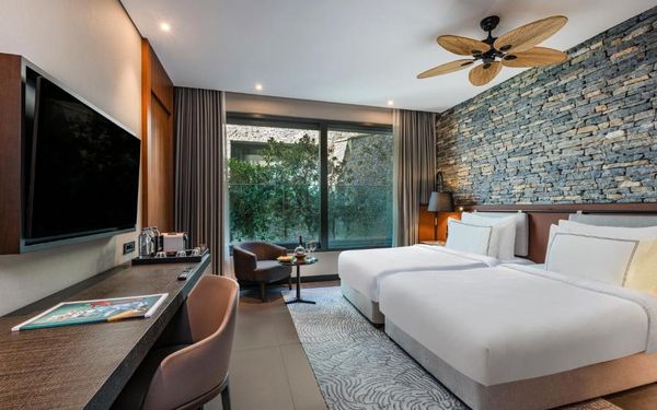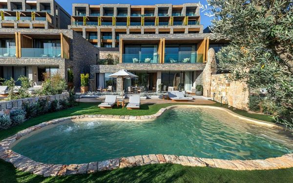 All rooms and suites are elegantly designed and include private balconies or terraces, modern interiors, and premium amenities. Selected villas, nestled among natural rock formations, offer private pools and gardens for an elevated sense of privacy and luxury. Each accommodation features air conditioning, a flat-screen TV with satellite channels, a walk-in wardrobe or seating area in select rooms, and a stylish bathroom equipped with double sinks, bathrobes, slippers, and luxury toiletries.