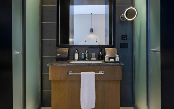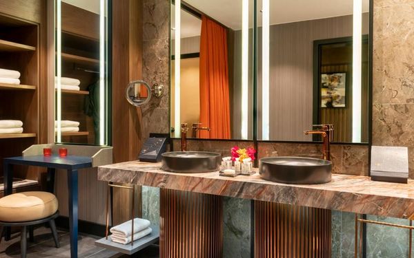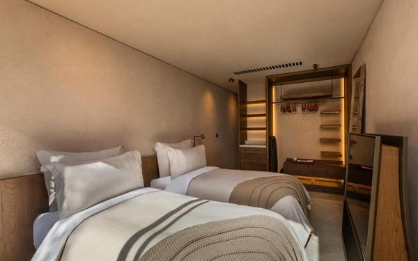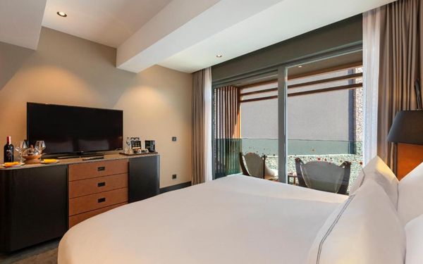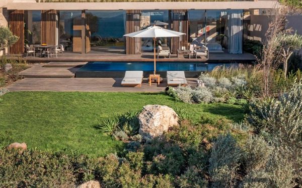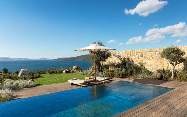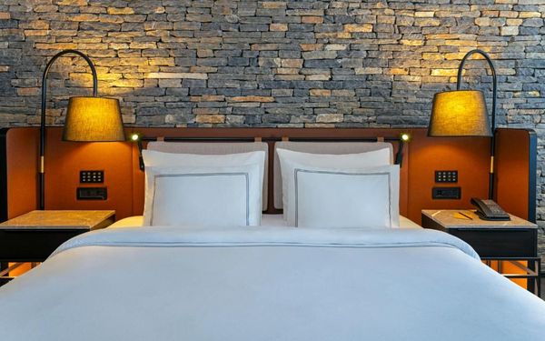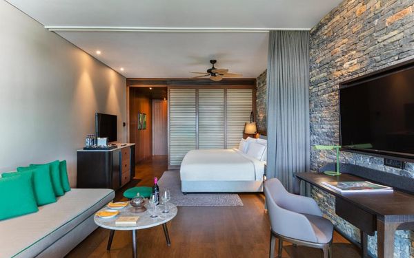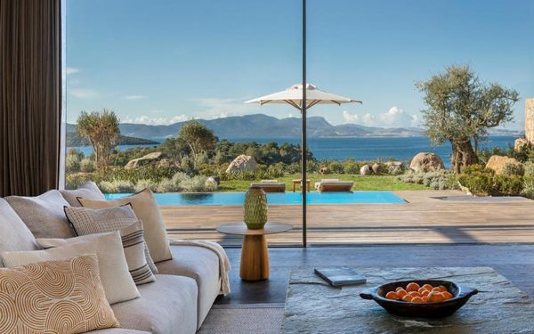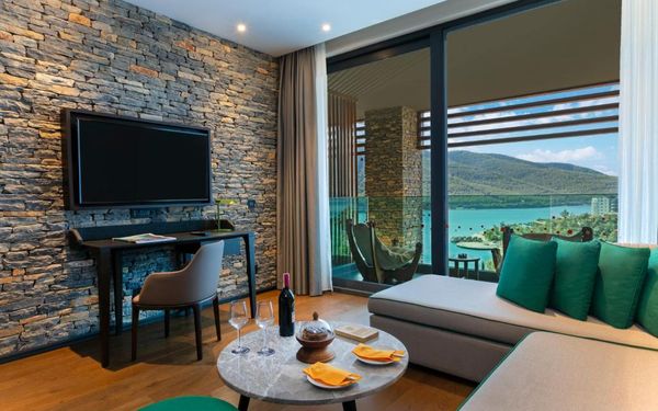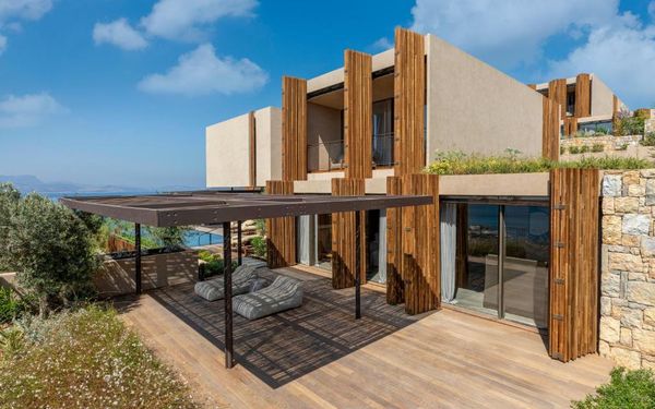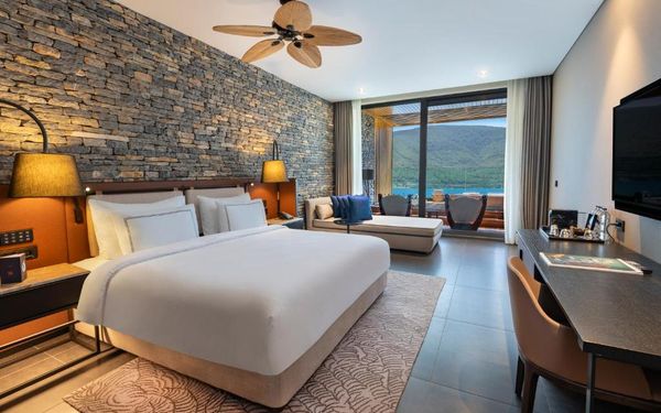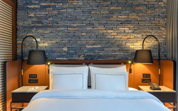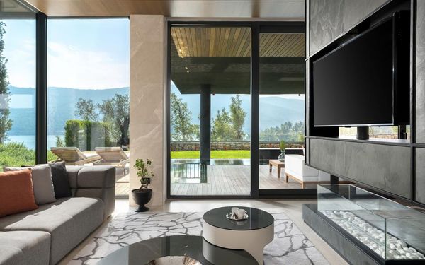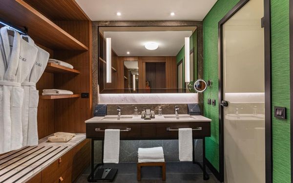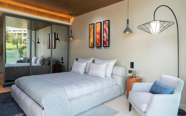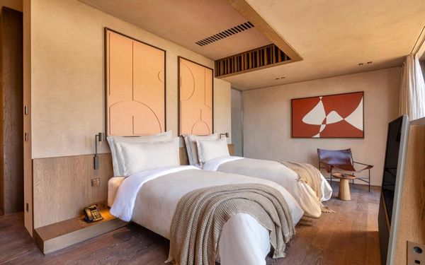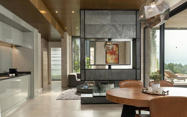 All rooms and suites are elegantly designed and include private balconies or terraces, modern interiors, and premium amenities. Selected villas, nestled among natural rock formations, offer private pools and gardens for an elevated sense of privacy and luxury. Each accommodation features air conditioning, a flat-screen TV with satellite channels, a walk-in wardrobe or seating area in select rooms, and a stylish bathroom equipped with double sinks, bathrobes, slippers, and luxury toiletries.
