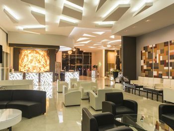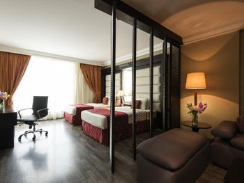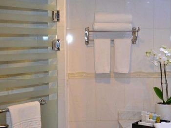 Нам достался номер на 5 этаже, окна выходили на соседнее здание, где видимо были расположены блоки кондиционеров. Было 1 окно, которое можно было открыть - но оно не закрывалось вплотную, поэтому шум с улицы + шум от дискотек - не лучшая идея выспаться.... Номер на фото конечно же выглядит лучше , уже все потертое и давно не новое. На такой огромный номер - все по 1 экземпляру : зубная щетка, тапки, халат застиранный...так же были мини шампунь, крем для тела, гель для душа. Шторки в душе нет, фена нет, утюга нет, хотя есть гладильная доска. Пришлось идти на ресепшн просить фен и адаптер для розеток. Нет чайных ложек, опять же 1 палочка для размешивания сахара.
