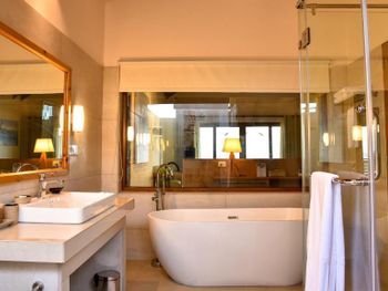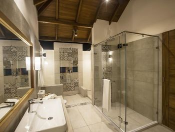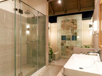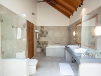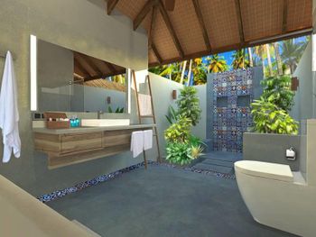 На вилле стояла ванна, но напор воды был очень слабый - наполнение ванны занимало 4 часа (фото). Вызвали техника - починить не смог. Вид и состояние территории возле пляжных вилл - это ужас (фото). Есть Номера в саду, объединённые по 4 штуки , без выхода к морю, тоже странно (фото). Приватность практически нулевая, все виллы осень близко друг к другу, расстояние между ними 3-4 метра (фото). Риф абсолютно мертвый, на дне валяются стройматериалы, железные двери и куски металлической сетки. Чтобы понырять с маской и посмотреть подводную красоту, нужно покупать экскурсию.