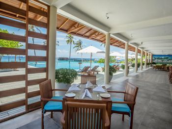 питание - что в общем ресторане, что в барах и ресторанах a la carte не умеют готовить. фруктов очень скудный выбор(или ананас, или папайя или арбуз, все в основном не спелое), если вы конечно ищите свежие фрукты, а не консервированные персики и сливы. выносить с собой целые яблоки, апельсины и бананы, например, нельзя, так как их просто нет в итоге на завтрак всю неделю питалась или овсянкой с медом или вареными яйцами, на ужин или паста или тушеная курица с овощами. из напитков нормальная только вода, особенно с лимоном риф - его тоже нет, нигде если берете водную виллу, то первая часть ее смотрит на остров(четные номера) вторая часть(нечетные номера)смотрит на закат(закат красивый), но также это является и взлетно-посадочной полосой гидросамолётов по всему периметру острова стоят волнорезы к вечеру много мусора прибивается к водным виллам и берегу в виллах на острове много всяких мошек и комаров в общем не советую