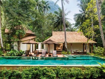 Surrounded on all sides by tropical gardens and beaches, Rayavadee- SHA Extra Plus features free-standing 2-storey pavilions and beachfront pool villas. Each room has a terrace, a flat-screen TV and a minibar.