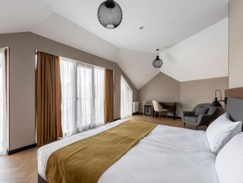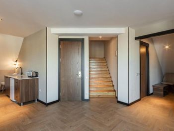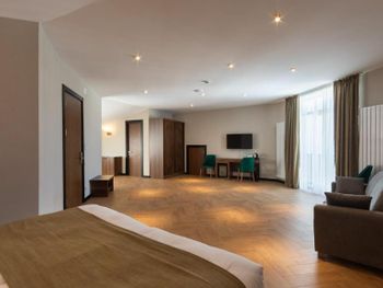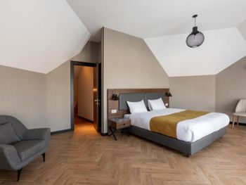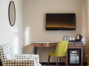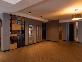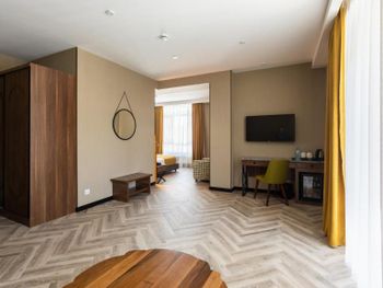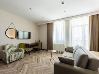 Просторный номер и сам отель. Все стильное, европейское, достаточно новое. Много всяких диванов и кресел вне номера, телевизор, книги. Достаточно уютно.