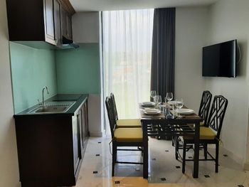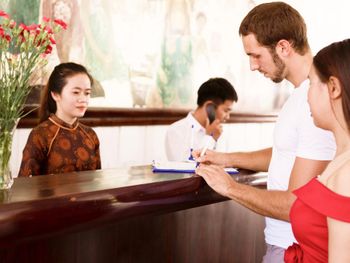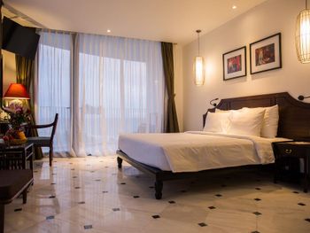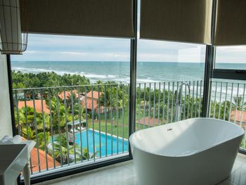 По прибытию в аэропорт мы заказывали трансфер ( в одну сторону предоставлен бесплатно). Нас встретили и довезли до отеля за 10 мин. на месте нам улучшили номер (может это связано с тем, что не было много гостей). Номер чистый, уютный, все обустроено очень красиво. В номере был диванчик и коксов, где можно посмотреть ТВ (было два) и выпить кофе. Кровать огромная и очень комфортная. В номере был кофе, чай, холодильник, сейф, чайник и т.д. В ванной можно найти все что вам необходимо, поэтому с собой ничего и не брали. В номере была ванна, довольно большая. Принимая ванну можно любоваться видом на море. Также был балкон с видом на море, где было два кресла и столик. Персонал очень отзывчивый и дружелюбный. Уборка проводилась ежедневно, меняли полотенца, щетки, мыло, мыли полы, кровать всегда убирали, но постель не меняли (дома мы тоже по нежели не меняем) так, что это была не проблема. Бассейн и столовая в 2х минутах, откуда вы сразу попадаете на море. Завтрак был очень хороший, от английского до вьетнамского. Также можно заказать еду в ресторане, если проголодались в течении дня. Вообщем, отель нам очень понравился. Будет возможность вернёмся ещё.