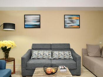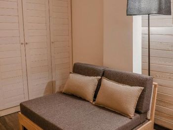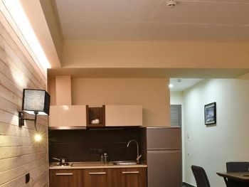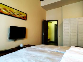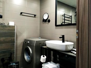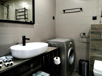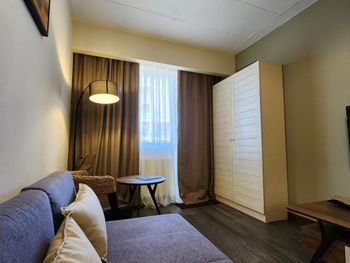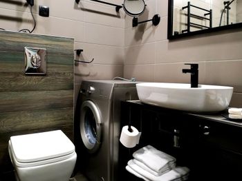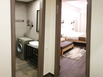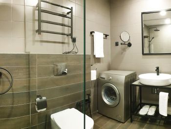 Отличная планировка номера, есть всё необходимое, микроволновка, плита, чайник и даже стиральная машина. Очень тепло. Две комнаты, каждая с дверью.