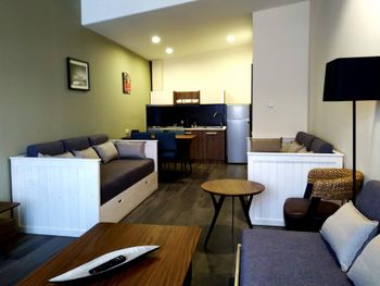 клиентоориентированность персонала отсутствует; отдыхали втроём с ребёнком, при этом 2 комплекта полотенец и объяснить, что требуется ещё один так и не удалось, по-русски не говорят, по-английски не понимают; при заезде телевизор не работал, плита имеет вилку, но розетка находится в соседней тумбе, а между ними стена (находка дизайнера)