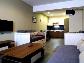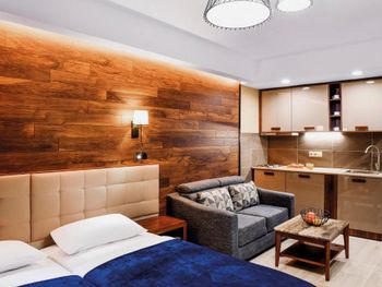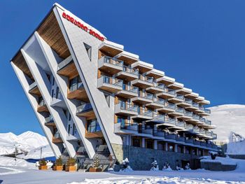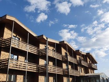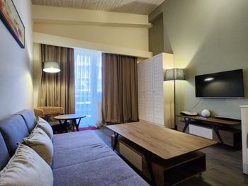 Хорошее расположение. Есть своя парковка. Так же есть сауна и бассейн с гидромассажем. Место для хранения лыж и даже прокат прям в здании.