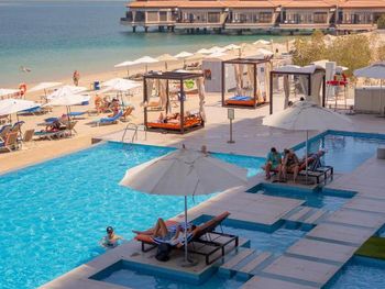 Мой номер был с выходом к бассейну - просто не берите его! Так как орущие дети и крик без остановки даже поздно вечером вам обеспечен! Дети это прекрасно, но если они не умеют себя вести и они не твои - на отдыхе это раздражает! Неудобный подъезд в отель и спуск - мне кажется нельзя давать 5 звезд отелю с таким подъездом! В ресторане еда понравилась, но заказав один и тот же салат - шеф повар каждый день его готовит по разному ) то есть исходя из базы продуктов! Но было вкусно! И да, хлеб обычный можно приносить посетителям, а не garlic и все в этом духе!