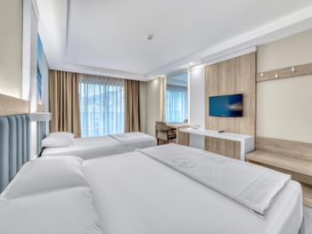 Отель 4 звёзды, но я бы дал максимум 3+. Персонал на стойке регистрации не самый приветливый, мне так показалось. Игнорируют до второго-третьего «HELLO!!!». Я забронировал отель как полупансион, это завтрак + ужин. Но при этом, в первый же вечер меня не впустили на ужин, сказав что у меня красный браслет, он только на завтрак, было очень неприятно, когда при всей толпе, очереди меня попросили уйти. Позже, я уточнил и все равно пришлось ждать, пока сотрудник уточнит все моменты :( Еда сносная, выбор небольшой. Состояние номера из 5 я бы оценил на 3. Мебель старая, где-то на стенах рисунки или царапины, кондиционер еле работает. Вода из душевой выливается на пол. Пришлось туда полотенце для ног подложить, все было мокрое. Если есть варианты лучше и дешевле, лучше выберите их. Может ко мне так относился персонал, потому что я забронировал отель как полупансион? Может просто сами такие.