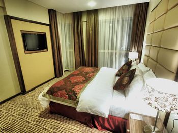 Хорошее место, рядом набережная и красивые мечети. Номер просторный и чистый, но уставший. Убирали каждый день. Меняли полотенца и белье. Из техники: холодильник, телевизор, чайник, кондиционер, утюг и фен. Рядом супермаркет.