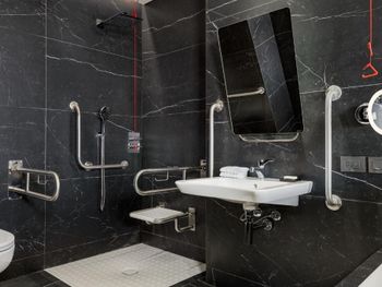 Мы были с человеком на инвалидной коляске - отель полностью приспособлен, есть лифты, широкие дверные проемы, удобные высокие кровати и матрасы. Огромный санузел! Есть и ванна, и душ в пол. Также есть средства для мытья.