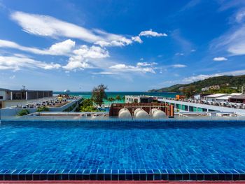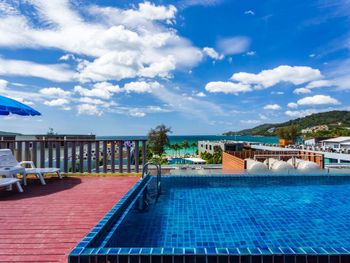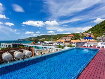 Понравилось близость к пляжу - 5 мин до северной части Патонга. Выбирали это сознательно - северная часть наиболее чистая. Неплохой бассейн на крыше - небольшой но чистый. Из бассейна видно море - можно условно назвать панорамным. К сожелению в основном видно крыши отелей со стоящими на них бочками для воды. Вокруг бассейна 4-5 шезлонга, есть мягкая зона отдыха с кож зам диванами. Уборка номера каждый день, замена полотенец по мере загрязнения - в неделю раза 3-4 меняли. Смена постельного белья у нас раз в 10 дней. Есть пляжные полотенца. В номере сейф телевизор ( 2-3 рос канала), чайник. Воду, чай кофе ложили каждый день. Нам условно повезло - вид на парковку отеля - у нас 4 этаж вид на горы. Поэтому берите 3-4 этаж. Наша сторона отеля выходила на парковку - другая сторона хуже - выходит на стену вокруг отеля а верхние этажи на стену соседнего отеля.