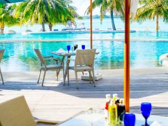 Нам очень понравился двухэтажный домик ,вид на море, чистота в нём и вокруг, тишина. Напротив него ( номер 78, это самое шикарное место на острове) находится риф с рыбками, особенно много рыбок под домиками на воде.Еда вкусная,особенно свежий хлеб и булочки.Хотя больше еды не европейской. Большой ,красивый и очень тёплый бассейн.Ездили на экскурсию на остров Гурайдо, пара часов за 37 долларов на человека.Приятный гид.