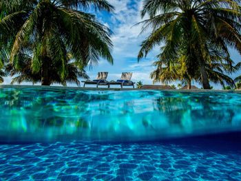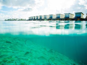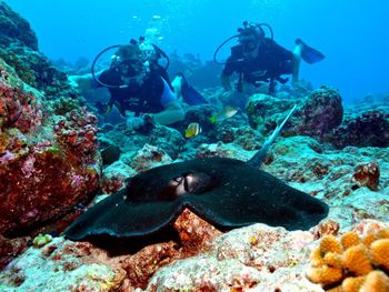 Риф. Очень маленький, но по факту живности столько же, сколько на рифе, на который возят в 8 утра на пол часа. Находится он сразу слева от входа на водные виллы. Так же много интересных рыб, акул и скатов под самими виллами.