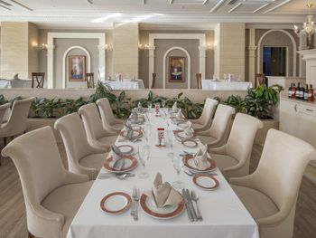 Гостиница по размеру напоминает отдельный город. В отличии от всех других гостиниц в Турции, где были налажены и увеличены сервисы в номера в связи с короновирусом, в данной гостинице обслуживания в номерах просто отменили в принципе (еды никакой заказать в номер нельзя, что просто ужасно), так же уменьшили количество людей, который ходят в рестораны а ля карт, в итоге, вся огромная толпа людей находится в общей столовой со шведским столом с очередями. Конечно, не очень подготовились к постковидной ситуации, так как все действия персонала наоборот провоцируют скопления. Рестораны а ля карт забронировать можно только по телефону день в день, на практике дозвониться из номера нельзя, так как в 09.00 на ресепшене собирается огромная очередь и передает друг другу трубку для бронирования (выглядит довольно смешно), при этом у последних в очереди нет гарантии, что они успеют забронировать. На пляже, как всегда было в Турции, вставая утром, нужно перед завтраком идти и занимать лежаки и зонтики, иначе рискуете остаться без таковых. Часть обозначенных ресторанов и услуг, обозначенных на сайте, закрыты. Еда соответствует формату шведского стола по качеству (без изысков), кроме великолепных десертов. в А ля карт ресторанах также уровень неплохого кафе, но не более.