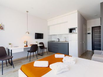 Удобное расположение. Приветливый и отзывчивый персонал. В апартаментах было всё необходимое для комфортного проживания. Чисто и уютно. Очень рекомендую для проживания!