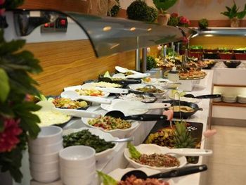 Изза ковида в ресторане очень сложно выбрать что хочешь съесть, стоят оградительные ленты и в далеке вообще не видно что предлагают покушать, приходится брать на угад. Тыкаешь пальцем и выбираешь просто курица/рыба/мясо, и тебе накладывают. Было очень сложно выбрать так как плохо видно вообще что за блюдо накладавали, подойти ближе нельзя.
