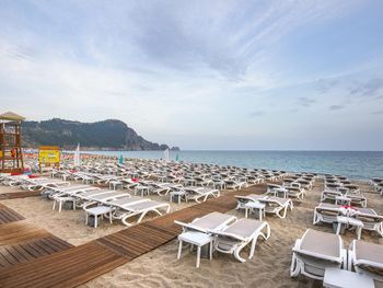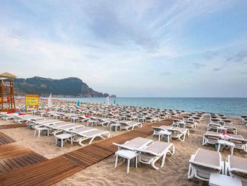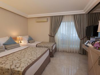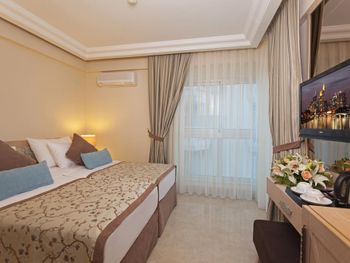 Ждали номер до 14:35. Что несколько огорчило вначале. Если едите с ребёнком или детьми лучше берите два номера. На узком диванчике что раскладывается спать может ребёнок наверное свободно только пятилетний или младше. Постарше ребёнку тесновато. Громкая музыка на русском допоздна - учитывайте это если вы с детьми. Питание было самое слабое из всех отелей что мы посетили в Турции в октябре. Ходили часто в кафе и рестораны рядом на улицах. Если не ищите супер-условия, а просто хороший пляж то принципе нормально. Мы были 2 дня и нас устроил и отель и пляж и персонал. Несмотря на общий спад туристов в этом отеле было их много и отдыхали гости активно, поэтому отель имеет спрос и слава Богу. Всем процветания!