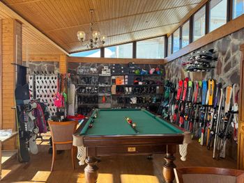 Красивая веранда для фотографий, отвозят/привозят к подъёмнику (идти в снаряге или со своей снарягой очень не удобно)