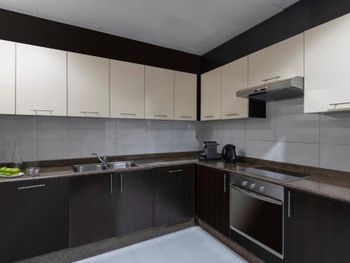 Расположение относительно метро (стоит 2 Реала) и торгового центра. Автобусная остановка (автобус 10 реалов) совсем рядом. У нас был номер с 4 спальнями (написано 3, но их 4), 4 туалета, кухня полностью оснащённая всем вплоть до тостера, вся посуда, стиралка, микроволновка, холодильник, вообще все в номере есть. 160 метров. Большой зал, диван в нем не раскладной. Везде телевизоры, есть вести 24 и ртр планета. Инет очень хороший, работает везде. 2 бассейна. Внизу и на крыше открытый с подогревом. Фитнес. 23 этажа. Ездит Uber очень не дорого.